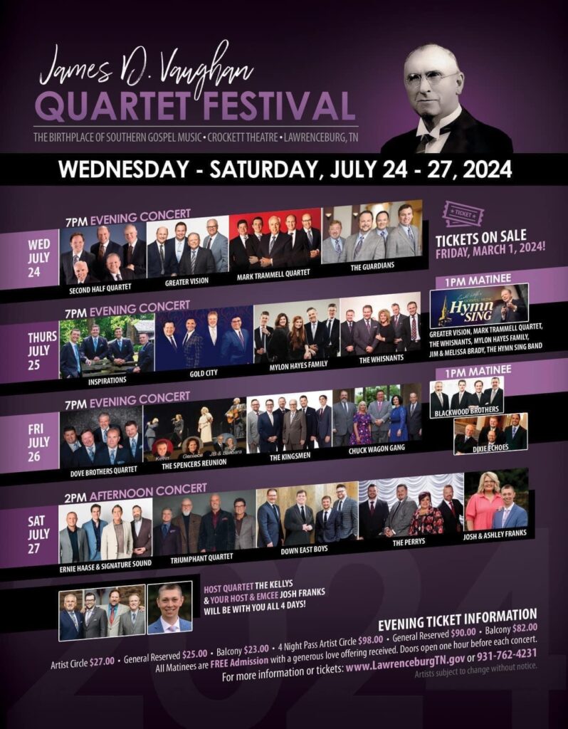 Lawrenceburg, known as the birthplace of Southern Gospel, celebrates the life and the music Mr. Vaughan loved each year downtown at the historic Crockett Theater. For more information or tickets, call 1-931-762-4231. You may also order your tickets online at www.lawrenceburgtn.gov.