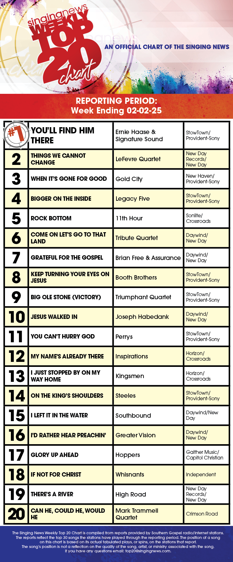 The Singing News Weekly Top 20 Chart is compiled by the Singing News in cooperation with Southern Gospel Radio networks and major market radio stations nationwide.