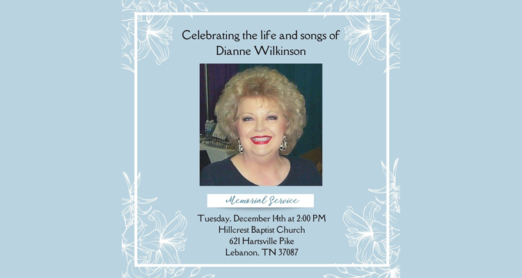 Rick Shelton of Daywind Publishing has shared the following, “This has been a tough week for the Southern Gospel family. We plan to honor our friend, Dianne Wilkinson, and celebrate her life and her songs. We are preparing a program filled with her best loved and biggest hits along with stories and tributes. The following individuals have committed to perform so far: Gerald Wolfe, Scott Fowler, Rodney Griffin, Chris Allman, Danny Funderburk, the Booth Brothers, Tribute Quartet, Terry Franklin, Pat Barker, Tim Parton, Arthur Rice, Danny Riley and more. It will be a special time for all of us.”