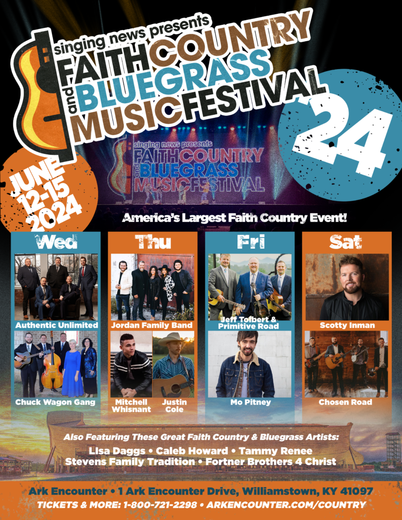 (For Immediate Release: March 21, 2024) The Faith Country & Bluegrass Festival returns to the Ark Encounter in Williamstown, KY on June 12-15, 2024. This is the third year for this incredible event that continues to grow year-over-year.