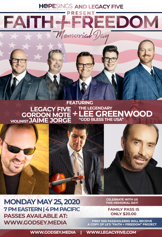 Legacy Five’s annual Memorial Day celebration concert has had to understandably be canceled. They are partnering with The HopeSings Concert Series and Godsey Media to promote the FAITH + FREEDOM Concert on Memorial Day. The concert will feature Legacy Five, Gordon Mote, violinist Jaime Jorge, and the Legendary singer/songwriter of “God Bless The USA”, Lee Greenwood. What a way to celebrate!