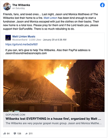 “The Wilbanks are very popular gospel music group. Jason and Monica Matthews of that group Lost absolutely EVERYTHING last night in a house fire. They barely got out with the clothes on their back. They also lost some music equipment, musical instruments, etc.