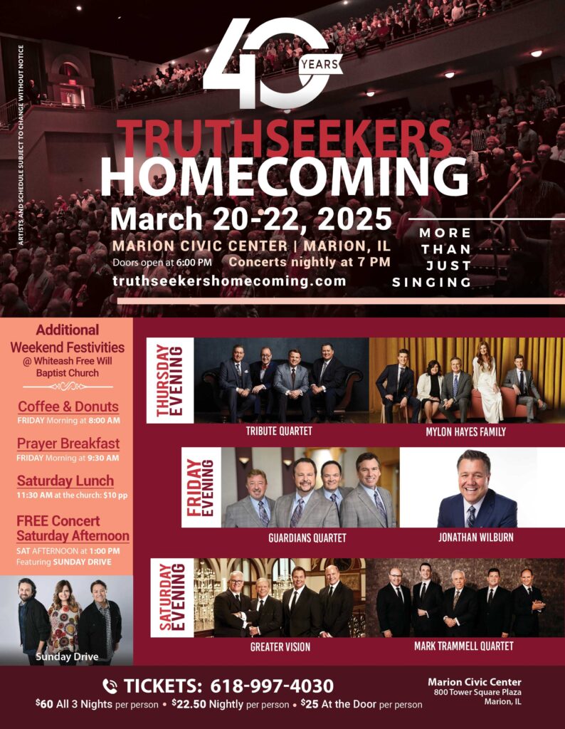 The Truthseekers Homecoming will celebrate its 40th Anniversary in March. As part of the celebration, the event will return to three nights. After the pandemic, The Truthseekers Homecoming scaled back to a two-night event. Since then, attendees have requested a return to the original format. Jill Snider, the event’s promoter, shares, “There’s no better time to go back to three nights than to do it in the year we recognize and honor four decades of God’s faithfulness and blessing.”